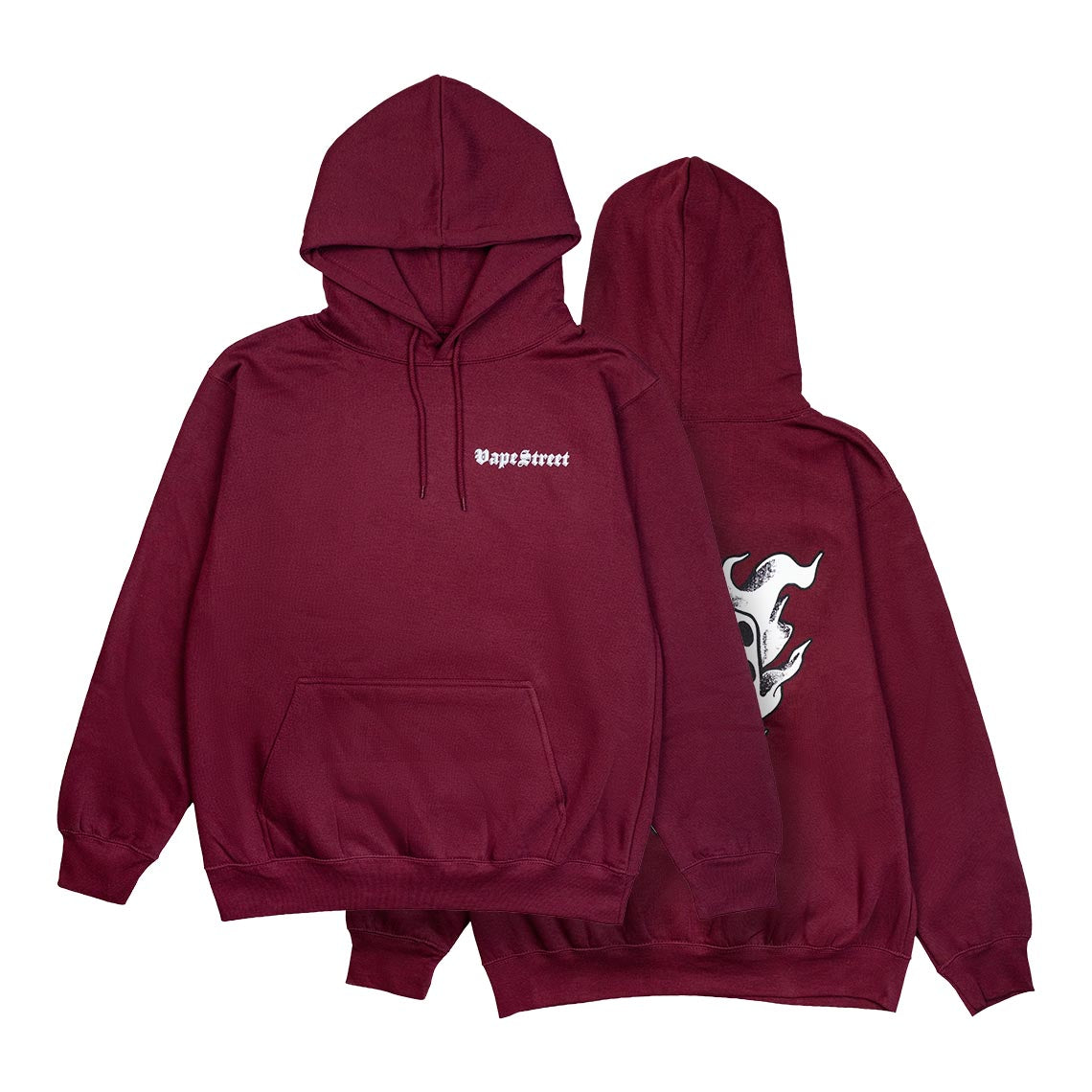 Show your style with the Vape Street Burgundy Fire Dice Hoodie. Blackletter “Vape Street” on the front left pocket meets a blazing dice design on the back for a striking streetwear look. Soft, warm, and built for comfort, this hoodie makes a bold statement while keeping you cozy. Perfect for fans who live and breathe Vape Street.
