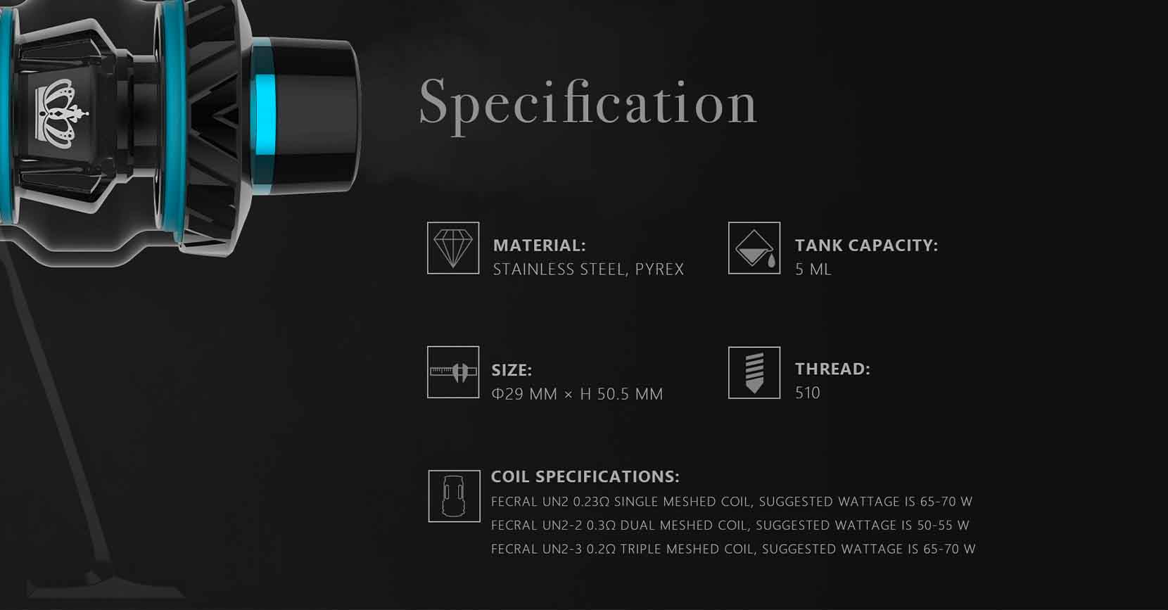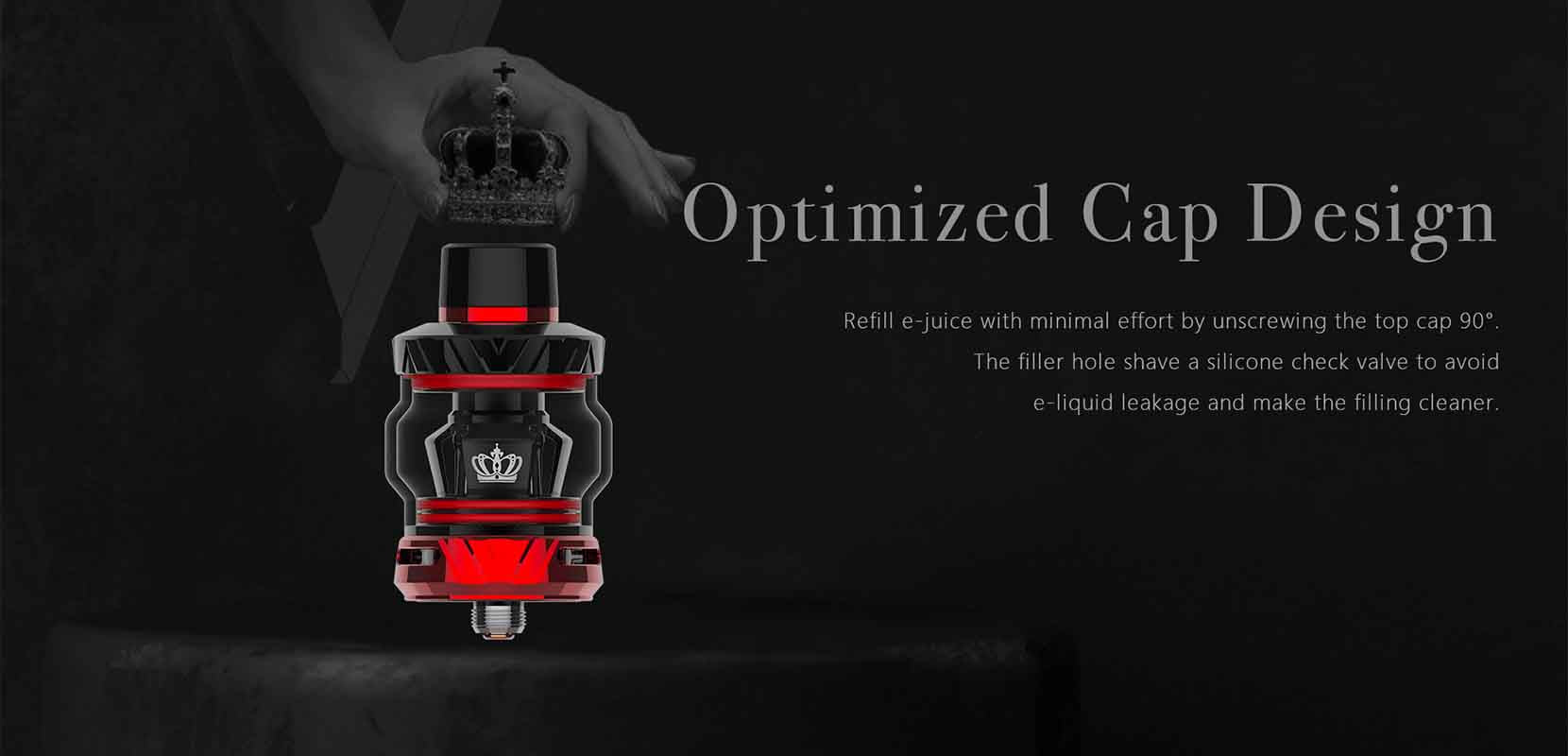 In addition, at the base of the tank is a dual slotted airflow control ring that can be opened or closed fully to carefully meter airflow into the tank, allowing the user to find the ideal rate of airflow for optimal flavor or cloud production. Introducing a new coil series, the Crown 5 tank utilizes Crown 5 Coils, all constructed in a mesh manner to deliver intense flavor and vapor output at lower wattages.