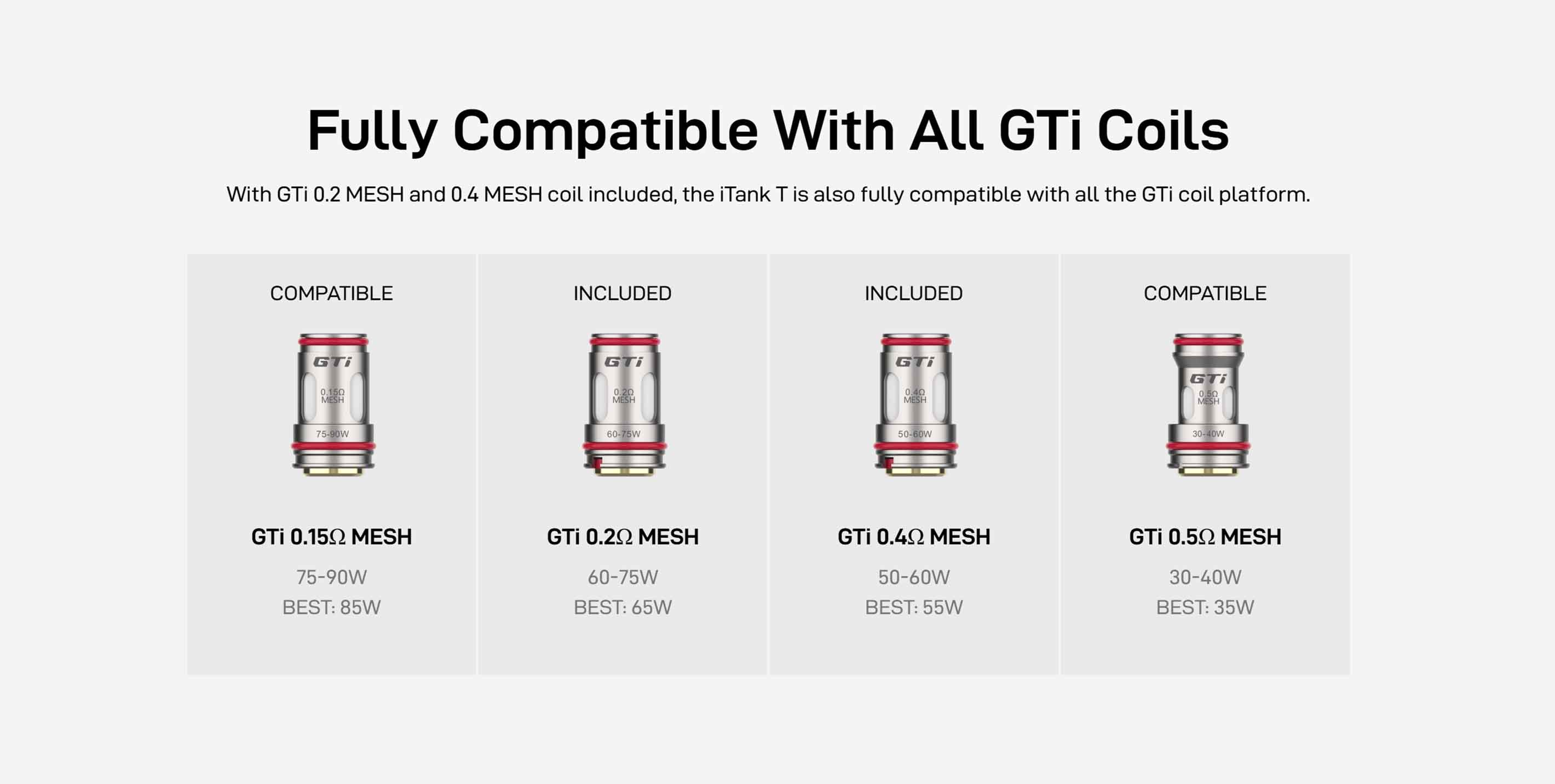 • Coil Compatibility: Vaporesso GTi Mesh Coils (0.2Ω and 0.4Ω included)
